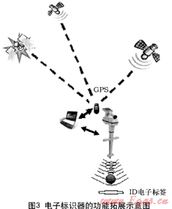 圖3是電子標識器的功能拓展示意圖,由GPS現場記錄電子標識器的經度、緯度、海拔高度等信息,將數據上傳到電子地圖系統,由此記錄標識器所在位置的絕對坐標[4]。