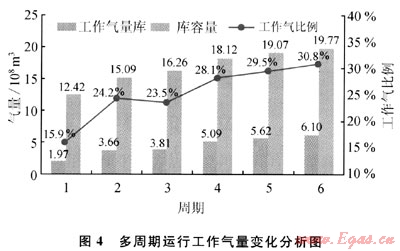 工作氣能力快速提高,工作氣比例總體增加,其變化示意圖見圖4。經過6個周期后,工作氣量由1.97×108m3增至6.10×108m3,增加2.1倍。工作氣比例由15.9%增至30.8%,增幅為90%。