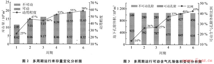 可動用庫存量逐漸增加,不可動用庫存量總體略有降低,庫存的動用程度隨之增加,其變化示意圖見圖2。經過6個周期后,可動用庫存量由2.85×108m3增至11.63×108m3,增加了3.1倍;不可動用庫存量由8.62×108m3降至8.32×108m3,降幅為3.5%;庫存動用程度從25%增至58%,提高了1.3倍,但目前仍有42%庫存不可動用。