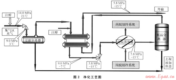 當濕天然氣壓力較高或溫度較低時,都易形成天然氣水合物,必須加入天然氣水合物抑制劑。在開工初期,雖然井口溫度較高,但管線溫度場未建立,也有生成天然氣水合物的可能。采用注入甲醇不回收工藝,采用移動注醇車以節省投資;在凈化工藝的低溫分離段,采用注入乙二醇并回收的工藝,與注甲醇工藝相比,具有占地面積小、投資低、環境污染小、能耗小、運行費用低等優點。