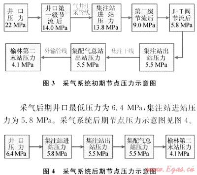 采氣后期井口最低壓力為6.4MPa,集注站進站壓力為5.8MPa。采氣系統后期節點壓力示意圖見圖4。