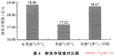 經濟指標為財務內部收益率,財務凈現值,靜態投資回收期,動態投資回收期,投資利潤率和投資利稅率[6]。根據經濟指標得出:3種情況的財務內部收益率均大于30%,大于石油財政基準收益率12%;若增添壓縮機,則投資成本能夠在1a內收回;靜態和動態投資回收期均小于1a。如圖4,添加壓縮機回收低壓氣比目前壓縮機生產的財務凈現值能多獲得1.45億元。