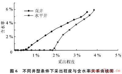 對于同一個邊底水油藏,采用不同的井型邊底水推進的速度是不一樣的。對于強底水情況,模擬了圓形地層中心1口直井或1口水平井的開采情況,其采出程度與含水率關系曲線見圖6。從圖中可以看出,水平井的無水開采期比直井的無水開采期長得多,水平井的采出程度也比直井高。因此同等情況下,水平井的開發效果要好于直井的開發效果。