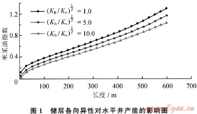 通過對水平井擬三維產能方程進行離散得出了不同各向異性系數(水平滲透率與垂向滲透率比值的開方)下,水平井長度和米采油指數的關系。