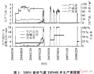 THN1凝析氣藏的生產動態資料顯示,2007年7月開始排液采氣時,排液井僅2口——THN2、THN4H井,且排液僅15d(7月12~27日)后即關井,至8月12日又才開井排液。排液井數少、排液時間短,在短時間內不能完全阻止已推進氣藏內部的邊水繼續向前推進,導致內部氣井,甚至一線井都不見效。