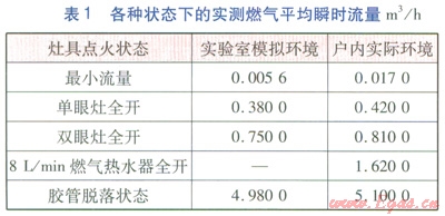 基表型號為Gl.6,氣源為天然氣,壓力為3000Pa,燃具在各種狀態下測定的瞬時流量經整理后的平均值見表1。