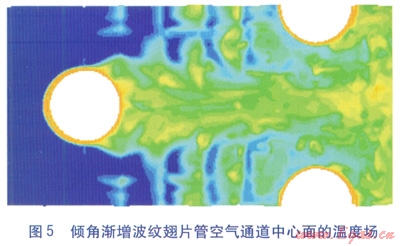 空氣進口速度為4m/s時,兩種波紋翅片管空氣通道中心面的溫度場分別見圖4、5。由圖4、5可知,兩種波紋翅片管的溫度分布都很紊亂且成狹長帶狀。在迎風側,傾角漸增波紋翅片管空氣通道中心面空氣溫度上升得較快,且出口溫度高于均勻傾角波紋翅片管。這是由于傾角漸增波紋翅片結構加強了氣流擾動,從而強化了換熱。兩種波紋翅片管的共同點是:在迎風側,溫度場分布稠密,溫度上升較快,換熱較強烈;在背風側,溫度場分布稀疏,溫度變化較小,換熱較平緩。