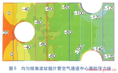 空氣進口速度為4m/s時,兩種波紋翅片管空氣通道中心面的壓力(表壓)場分別見圖6、7,圖中數值單位為Pa。由圖6、7可知,兩種波紋翅片管的壓力分布均比較紊亂。傾角漸增波紋翅片管空氣通道中心面的壓力降要大于均勻傾角波紋翅片管,且隨著翅片傾角的增大,等壓線分布更加稠密。原因是傾角漸增波紋翅片結構對流體的阻滯和擾動作用都較大,阻力比均勻傾角波紋翅片管大。