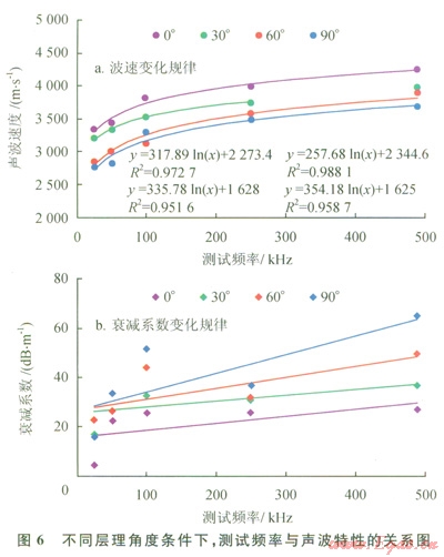 實驗結果表明,隨著測試頻率增加,聲波波速也增大,并且呈對數正相關性(圖6-a),頻散現象明顯,在不同層理角度條件下的各組巖心統計結果非常吻合,具有很強的規律性。而聲波衰減系數隨著測試頻率的增加總體也呈增大的趨勢(如圖6-b),但是變化幅度規律性不強,同層理角度條件下的各組巖心統計結果相近。該結果對于儲層評價中聲波參數的選擇具有一定的指導意義。
