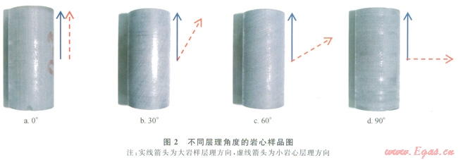 在此基礎上,分別沿平行層理方向(圖2-a)、與對稱軸呈一定角度(30°、60°,如圖2-b,2-c)、垂直于平行層理方向(圖2-d)進行小巖心鉆取,利用鉆機控制層理角度誤差小于5%,為了不影響測試效果,所切制樣品直徑均在1英寸左右(25.4mm),長度介于37.87~51.11mm,兩端面磨平拋光。