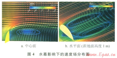 根據(jù)CFD模型計算的一般步驟,在做瞬態(tài)計算之前,首先應求解穩(wěn)態(tài)的速度場[14],計算結(jié)果如圖4所示,在水幕的前后均有渦旋生成,水幕的上風向側(cè)底部,有一個尺寸較小的渦旋,在水幕的下風向測,可以很清晰的觀察到,無論在豎直方向上還是水平方向上,均有渦旋生成,并且尺寸較大,豎直方向上的渦旋會將穿過水幕后的氣體向上卷吸,而水平方向上的兩側(cè)渦旋,能夠?qū)⒋┻^水幕的氣體向中心線處收攏,對LNG蒸氣云團擴散產(chǎn)生較大影響。