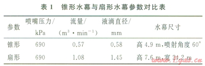 表l[11-12]顯示了兩種水幕在相同壓力和管徑條件下,水幕的流量、液滴直徑以及水幕尺寸的對比,可以看出錐形水幕較扇形水幕流量少、液滴直徑小,并且水幕高度小,約兩個錐形水幕的流量等于一個扇形水幕的流量。為了將兩種水幕對LNG蒸氣云擴散的阻擋效果進行對比,可以將多個同時作用的錐形水幕近似看作矩形水幕,相鄰錐形水幕的重疊區(qū)域為自身尺寸的一半。