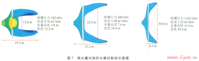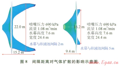 下面對扇形水幕的參數(shù)進行研究,包括噴水量和水幕和擴散源之間的間隔,這二者是影響水幕阻擋效果的主要因素。圖7顯示了不同水流量下,水幕對氣體擴散的影響,在相同的大氣條件下,水流量越大,形成的水幕尺寸也就越大。當扇形水幕流量為l.32m3/min,壓力1035kPa時,水幕高度為11.4m,寬度45.6m,LNG蒸發(fā)氣體下風向擴散的安全距離為8.3m。