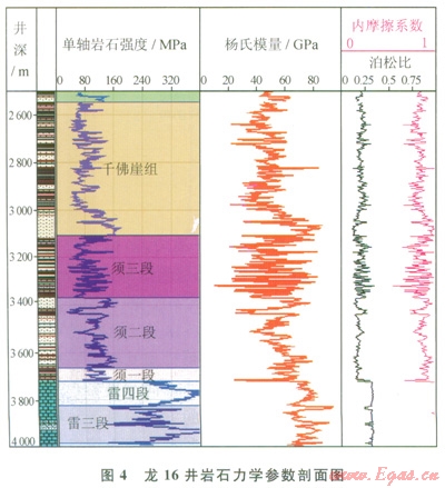 GMI地應力模型提供了三軸主地應力(上覆地層壓力、最小水平主應力、最大水平主應力)的大小和方向、地層孔隙壓力、巖石機械力學性質(單軸巖石強度、楊氏模量、內摩擦系數、泊松比)等4項參數的計算和描述。特殊地區還需考慮薄弱地層(特殊地層如鹽層)、原生斷層、裂縫的分布、地熱因素影響等。我們根據九龍山構造的鉆井、地質、測井(包括成像測井)、測試等資料,以龍l6井為例建立了九龍山構造的地應力模型,基本摸清了本區的現今地應力狀態。