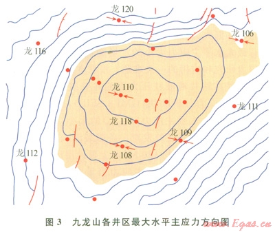 由于地層在水平方向存在應力差,鉆井產牛的垮塌和張性裂縫的方位可以用地層傾角測井和成像測井方法進行判定[6-7]。分析龍002-1、龍l6、龍l01、龍110、龍l05、龍l09、龍ll6、龍ll8和龍l20等9口井的成像測井圖像,各井井壁出現垮塌和張性裂縫均具有規律性方向分布,按井壁垮塌方向與最大水平主應力方向垂直,而張性裂縫出現的方位與最大水平主應力方向平行的形成機制,判斷九龍山現今地應力為近東西方向,即l06°~l20°,各井區基本一致(圖2、3)。