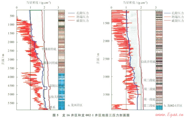 把九龍山構造地應力狀態和巖石力學參數有機結合起來,計算獲得九龍山構造的龍16井區和龍002-l井區地層三壓力剖面(圖5)。