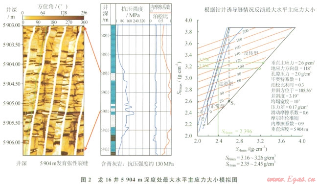 最大水平主應力大小的定量確定比較困難,這是地應力研究和應用的一大難題。根據本區成像測井分析了各井在鉆井液液柱壓力下的井壁破壞類型及程度,利用地應力分析模塊(GMI*SFIB),反演模擬小同深度處最大水平主應力(SHmax)的大小。圖2顯示龍16井5904m深度處發育一條張裂縫,巖性為含膏灰巖,巖石抗壓強度約l30MPa,上覆地層壓力當量密度2.60g/cm3,最小水平主應力當量密度約2.30g/cm3,鉆井液密度(2.23~2.283/cm3)與孔隙壓力當量密度之差為0.173/cm3,選取Mohr-Colum巖石破壞準則,反演模擬其最大水平主應力當量密度為3.15~3.263/cm3。