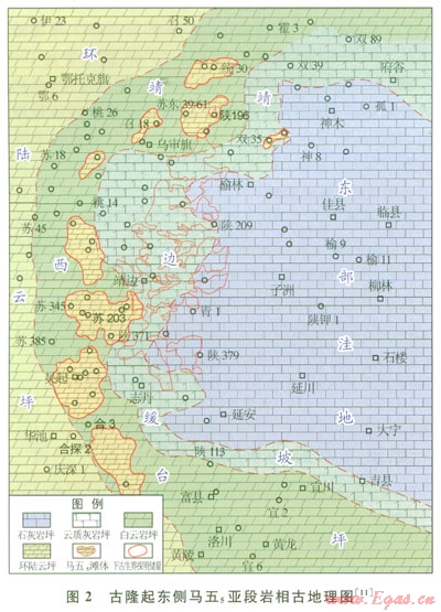 受沉積期古隆起控制,奧陶系下古生界中組合馬五5亞段沉積相呈環帶狀展布[9],局部發育的顆粒灘沉積經白云巖化形成高滲儲層。在靖邊氣田西側由于馬五1一馬五4段區域剝蝕,馬五5亞段與上古生界煤系烴源巖直接接觸,有利于天然氣富集成藏[10]。