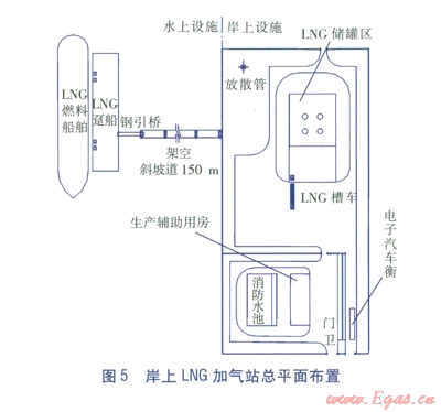該方案是將LNG的裝卸、儲存及配套的供電、消防、控制設施設在岸上的LNG站區內,水上的躉船上不設LNG儲罐,只設LNG加氣機、加氣臂等加氣設施,進行岸上儲存、船上加氣作業。