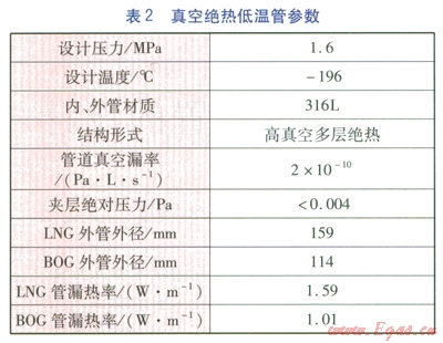 架空斜坡道上的LNG輸送管道內管為公稱直徑80mm的真空絕熱低溫管道,BOG管道內管為公稱直徑50mm的真空絕熱低溫管道。真空絕熱低溫管參數見表2。