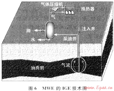 工藝流程:先將高溫蒸汽注入油頁巖地層中,對流加熱油頁巖,與油頁巖換熱后,把熱解生成的油氣載到地面上來,冷凝、回收。分離后的不凝氣被加熱到一定溫度后通入到地層與油頁巖換熱,循環(huán)利用(圖6)。MWE公司稱,該工藝中1口井的覆蓋面積可達3000m2,產油超過8100t/a[12]。