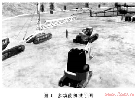 通過仿真平臺模擬展示了滅火搶險作業的核心設備——多功能機械手隅7。,充分展現了罩引火筒、挖掘清障、剪切清障、破碎井場水泥基礎,運送遠距離水力噴砂切割頭、吊裝單件井口裝置等功能(圖4)。