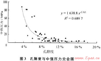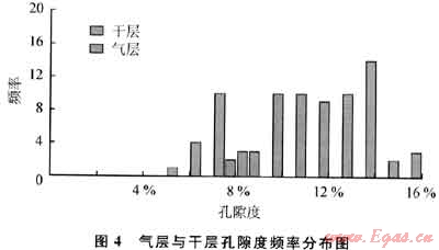 有效孔隙度下限確定有兩種方法:①根據(jù)壓汞資料,分析中值壓力與孔隙度的關(guān)系,當(dāng)孔隙度小于某一值時(shí),中值壓力迅速增大,說(shuō)明當(dāng)孔隙度小于該值時(shí),汞基本壓不進(jìn),即這部分孔隙基本為無(wú)效孔隙[6~7](圖3),利用該法確定的研究區(qū)有效孔隙度下限為7%;②統(tǒng)計(jì)試油產(chǎn)層段與干層段孔隙度的分布特征來(lái)確定(圖4)。由圖3可知,干層和氣層孔隙度的分界線在7%左右,可見(jiàn)該區(qū)儲(chǔ)層有效孔隙度取7%比較合適。