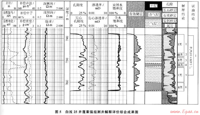 白淺25井蓬萊鎮(zhèn)組井段746~754m,綜合分析該段為較純的細(xì)-中粒砂巖儲(chǔ)層,長(zhǎng)石含量較高,粒度較細(xì),導(dǎo)致自然伽馬值極高(圖5),巖心分析孔隙度高達(dá)19.97%,平均值為16.72%。測(cè)井綜合分析處理后解釋了Ⅰ類、Ⅱ類和Ⅲ類氣層各2個(gè)(圖5)。738.4~756.5m井段測(cè)試產(chǎn)1.659×104m3/d工業(yè)氣流。