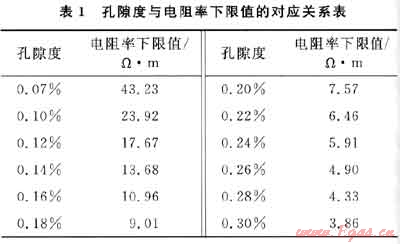 根據(jù)工區(qū)地層水電阻率、含氣飽和度、膠結(jié)指數(shù)、飽和度指數(shù)等參數(shù),建立孔隙度與氣層電阻率下限值關(guān)系,并計(jì)算氣層電阻率下限值關(guān)系曲線[4~5],比較該曲線與深側(cè)向電阻率值大小來(lái)判別儲(chǔ)層。即:電阻率值大于氣層下限值,為氣層;否則為氣水同產(chǎn)或產(chǎn)水。表1為某區(qū)塊孔隙度與電阻率下限值,由此獲得了氣層下限電阻率計(jì)算公式為:
