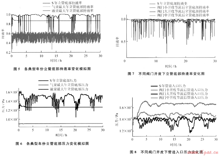 對(duì)3個(gè)典型年份(氣量最大年、液量最大年及油氣田開(kāi)發(fā)后期的S年)進(jìn)行了模擬,模擬時(shí)間為30h。各年份的氣油比為90。隨著油氣田開(kāi)發(fā)的進(jìn)行,油氣含水量逐年增大,S年油氣含水率達(dá)75%,油氣產(chǎn)量為氣量最大年的1/8,為液量最大年的1/4。