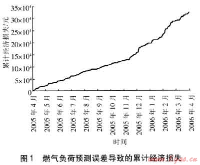 為能更準確地反映出各時間段的用氣規律和特征,將每個統計年劃分為4月1日至10月31日、11月1日至次年3月31日兩個統計區段,分別稱為當年的夏半年和冬半年[6~7]。根據燃氣負荷預測經濟性評價模型,以某城市為案例,對其2005年4月至2006年3月的燃氣負荷預測結果進行經濟性評價。假設基準氣價為1.5元/m3,得到的累計經濟損失見圖1。