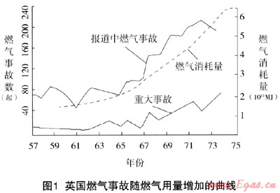 隨著我國城鎮燃氣使用的普及,室內燃氣事故也層出不窮,如何減少室內燃氣事故帶來的生命傷害和財產損失是人們持續關注的焦點。統計表明,燃氣爆炸的事故數與燃氣用戶和燃氣消耗幾乎成正比,如圖1所示為英國燃氣事故的統計。為了維護燃氣客戶的生命財產安全,有必要對事故的成因、規律及危害進行分析以找出相應的防范措施。本文就是探索這類事故產生和發展的規律,提出有效的預防和控制措施,解決目前燃氣行業亟待解決的居民用戶安全問題,因此具有重大的社會經濟效益。