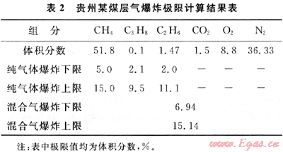 以貴州某煤層氣為例,利用以上方法計(jì)算了多組分煤層氣的爆炸上限和下限(見表2)。由表2可以看出,混合氣的爆炸極限與純氣體的爆炸極限有一定區(qū)別。