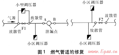 修復(fù)作業(yè)開始時(shí),派人在各調(diào)壓站監(jiān)測各小區(qū)中、低壓管網(wǎng)壓力,當(dāng)確定各小區(qū)均無大量用氣后,關(guān)閉泄漏點(diǎn)兩側(cè)的閥門F1、F2。在閥門F1、F2關(guān)閉后、放散燃?xì)馇埃瑢⒏餍^(qū)低壓壓力提高到2940Pa后,關(guān)閉小區(qū)調(diào)壓器,以滿足少數(shù)用戶的用氣需求(如果作業(yè)時(shí)小區(qū)的低壓壓力低于784Pa,可打開小區(qū)調(diào)壓器旁通供氣)。在F2閥門左側(cè)的放散管進(jìn)行放散,將中壓壓力降至784~980Pa。壓力降到搶修工作壓力后,開始作業(yè)。秦皇島市燃?xì)夤艿来蟛糠质堑冉孛骅T鐵直管道,接口采用錐套式柔性接口,因此不論泄漏點(diǎn)是位于管道接口還是管道本身,要想修復(fù)均需切掉一段泄漏點(diǎn)所在的管道(長約1m),更換新管道,重新使用連接套連接。切斷管道前,拆掉工作孔A、B上的閥門,塞入阻氣袋(防止切斷管道時(shí)放空燃?xì)猓烊肟諝猱a(chǎn)生爆炸)。然后切斷管道并更換新管道,進(jìn)行接口連接等工作。接口連接完畢,撤出工作孔A處的阻氣袋,通過F1處的小型調(diào)壓器輸送燃?xì)猓萌細(xì)庵脫Q新管道內(nèi)的空氣。置換完成后,撤掉工作孔B處的阻氣袋,稍開閥門F1,使管內(nèi)壓力緩慢上升,達(dá)到運(yùn)行壓力后,對(duì)接口進(jìn)行查漏。查漏合格則完全打開閥門F1、F2。在完全開啟閥門F1、F2前,各調(diào)壓站人員關(guān)閉小區(qū)調(diào)壓器旁通閥,準(zhǔn)備恢復(fù)正常供氣。另外,如果小區(qū)壓力低于588Pa,且搶修發(fā)生在夜間,為防止出現(xiàn)用戶室內(nèi)事故,應(yīng)先關(guān)閉調(diào)壓器,在清晨用氣前進(jìn)行恢復(fù)供氣的宣傳,才能開啟調(diào)壓器進(jìn)行供氣;如果小區(qū)壓力大于588Pa,可把壓力直接調(diào)整到正常壓力恢復(fù)供氣。以上工作完成后,回填作業(yè)坑,清理現(xiàn)場,作業(yè)結(jié)束。