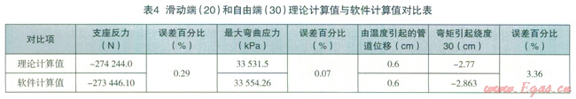 通過對兩種應(yīng)力計(jì)算結(jié)果的比較和誤差分析,很容易從上面列表中看出:理論計(jì)算值與軟件計(jì)算值中誤差最大者,即由管線自重引起的支座反力偶和最大彎曲應(yīng)力。這是由于軟件在計(jì)算過程中采用迭代法,而在理論計(jì)算中忽略了各投影面力矩之間互相關(guān)系的二次項(xiàng),從而造成兩者之間的誤差。因管線自重對整個管線應(yīng)力情況的影響最小,我們在進(jìn)行管線應(yīng)力分析時主要考慮的管線影響因素就是溫度和內(nèi)壓。