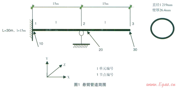 大口徑、厚壁管道,是指鋼管外徑和壁厚之比小于20的鋼管,廣泛應(yīng)用于自來水、天然氣、石油、化工、醫(yī)藥、通訊、電力、海洋工程等領(lǐng)域。其應(yīng)力分析主要是為了滿足管道設(shè)計(jì)強(qiáng)度和柔性要求,確保管道在各種工況下安全運(yùn)行,而載荷是導(dǎo)致管道內(nèi)產(chǎn)生應(yīng)力的基本原因。大口徑、厚壁管所受的載荷按照載荷性質(zhì)可分為靜載荷、動載荷和溫度載荷。為了便于分析,本文只研究管道所受的靜載荷,即對大口徑、厚壁管進(jìn)行靜力分析。該類管道的靜力分析主要有3類:一是壓力載荷和持續(xù)載荷作用下的管道一次應(yīng)力計(jì)算,為防止塑性變形破壞;二是管道熱脹冷縮以及端點(diǎn)附加位移載荷作用的管道二次應(yīng)力計(jì)算,為防止疲勞破壞;三是管系位移計(jì)算,為防止管道碰撞和支吊點(diǎn)位移過大。由于管路沿線的地貌復(fù)雜,引起管道應(yīng)力的因素較多,針對大口徑、厚壁管的應(yīng)力分析,我們主要考慮管系自重、內(nèi)壓和溫度3大要素。下面將以大口徑、厚壁管中的懸臂管道為例,對CAESARⅡ軟件應(yīng)用于這類管道的應(yīng)力分析作可行性研究。