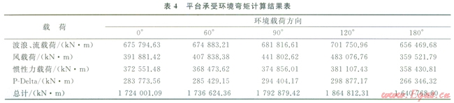 表3、4分別為平臺在該海域所受到各方向環(huán)境載荷、彎矩計算結果。