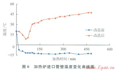 分析上述圖表數據可以得出:①改造后加熱時間減少了27.3%,再生氣用量減少了18.4%,加熱爐電耗量減少了28.6%;②由于再生氣余熱是一個自身循環預熱的過程,大約lh之后,換熱爐才開始對再生氣預熱,隨后加熱爐進口溫度緩慢升高,最后管壁溫度穩定在47℃左右;③再生氣余熱利用存在滯后,隨著換熱器逐漸換熱,加熱爐單位時間電耗量相比改造前電耗減小,充分說明再生氣余熱得到利用,達到了節能運行的目的。