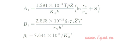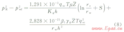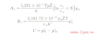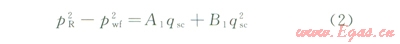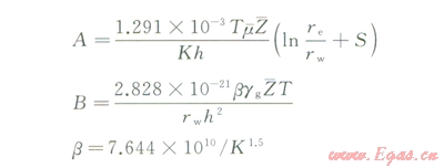 由氣水兩相流動時,氣井穩(wěn)定狀態(tài)條件下以壓力平方形式表示的氣相二項式產能方程式: