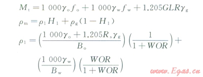 式中P為井筒中任意點的壓力,MPa;D為井深,m;rm為氣液混合物的密度,kg/m3;um為氣液混合物的流速,m/s;g為重力加速度,m/s2;fm為兩相摩阻系數(shù);d為油管內徑,m;qt為地面產液量,m3/d;Mt為地面標況下,每生產1m3液體伴生油、氣、水的總質量,kg/m3;H1為持液率;r1為液體密度,kg/m3;go、gg、gw分別為油、氣、水的相對密度;Rs為天然氣的溶解氣油比;Bo、Bw分別為油、水的體積系數(shù);WOR為生產水油比;rw、rg分別為水、氣的密度,kf/m3;¦w、¦o分別為所產液體中的含水率、含油率;GLR為氣液比。
