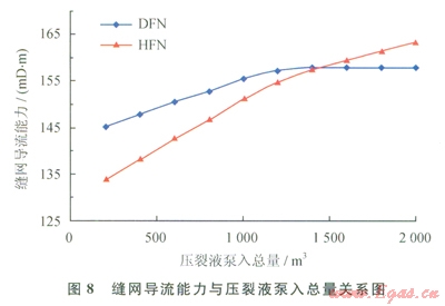 由圖8可知,隨著壓裂液泵入總量的增大,縫網導流能力增大;對于DFN模型,縫網導流能力從l45mD·m增大至l58mD·m,且當壓裂液泵入總量超過l200m3后,縫網導流能力基本保持不變;對于HFN模型,縫網導流能力從l34mD·m增大至l63mD·m。當壓裂液泵入總量低于l400m3時,DFN模型計算得到的縫網導流能力偏大;當壓裂液泵入總量高于1400m3時,HFN模型計算值偏大。