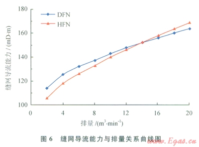 由圖6可知,隨著排量的增大,縫網導流能力增大;對于DFN模型,縫網導流能力從ll4mD·m增大至l63mD·m;對于HFN模型,縫網導流能力從106mD·m增大至169mD·m。當流量低于l4m3/min時,DFN模型計算的縫網導流能力偏大;當流量高于l4m3/min時,HFN模型計算值偏大。