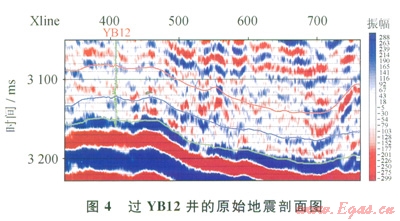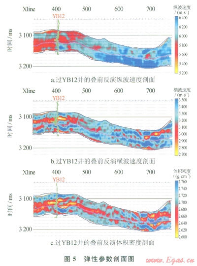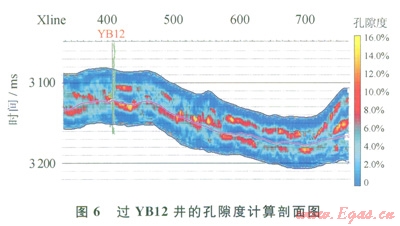 目前,各種地震疊前數據反演的軟件[16]。和疊前反演的方法[17-22]都比較成熟,通過較好的疊前三維地震資料可以較準確地反演出縱波速度、橫波速度和體積密度等彈性參數。圖4為過YBl2井的原始疊后地震剖面。儲層位于圖中標注的層位為下三疊統飛仙關組一段上二疊統長興組之間[23-25]。從剖面上可以看出地層的橫向變化大,分辨率低,信噪比較低等特征。圖5-a、b和c分別為應用疊前同時反演方法獲得的縱波速度、橫波速度和體積密度反演剖面。從圖中可以看出,井旁道反演的數據與測井曲線的相關性較好。從反演數據剖面中可以發現,疊前彈性參數反演獲得橫波速度數據和密度數據剖面的分辨率高于縱波速度數據剖面上的分辨率,為縱向高分辨率的孔隙度計算提供了條件。圖6為應用本方法計算的過YB12井的孔隙度剖面。從圖6中還可以看出,計算孔隙度與實測孔隙度之間的相關性非常高,計算的孔隙度數據的分布范圍也與測井數據相當吻合,并且從孔隙度剖面上能夠將該儲層段分為上下兩套孔隙度發育的儲層,孔隙度計算剖面上展布的橫向規律與地質、鉆井認識規律保持一致。因此,從孔隙度計算的結果可以看出,筆者提議的孔隙度計算方法在碳酸鹽巖儲層孔隙度計算中效果比較明顯,能夠較好地提高孔隙度計算的精確度。