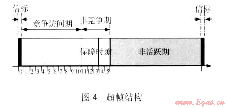 在IEEE802.15.4 MAC協議定義了超幀結構,如圖4所示。在幀群中存在兩個部分:活躍期與不活躍期(休眠期),在活躍期開放信道接入,休眠期關閉信道,進入休眠狀態以減少能耗。