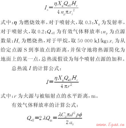 2,用時分別為27s和1162.3s,低于該熱流值時人員不會死亡、木質結構不會損壞。為此,危險輻射強度取15.77kW/m2,兩種工況下噴射火的危險半徑分別為45m和50m。