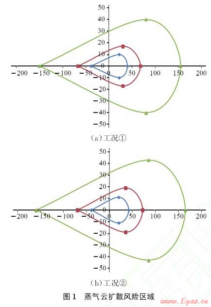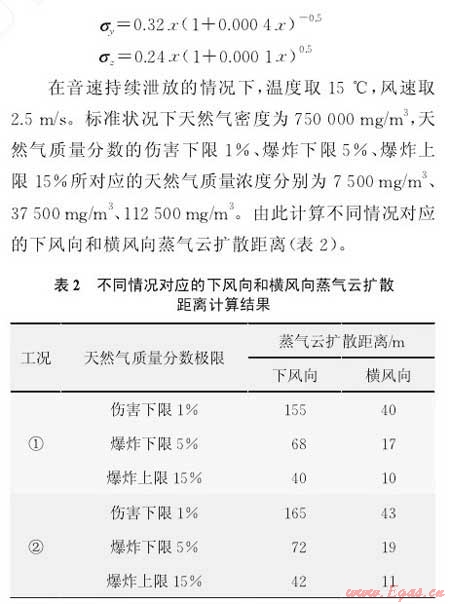 基于管道內部參數相關的壓力、泄漏面積、泄漏口形狀、管道內部質量(氣源狀況),以及管道外部參數相關的地面風速、大氣穩定度、地面狀況等,假設泄漏為穩態小孔泄漏,對天然氣管道泄漏影響區域進行計算,得出如下結論:
