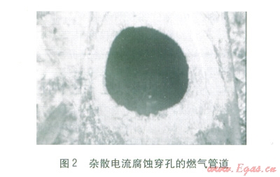 雜散電流腐蝕穿孔速度快,影響范圍廣,且隨機(jī)性強(qiáng)。雜散電流腐蝕創(chuàng)面光滑,邊緣較整齊,產(chǎn)生黑色腐蝕產(chǎn)物。修復(fù)方式同細(xì)菌腐蝕,但應(yīng)注意多數(shù)雜散電流腐蝕并不單一出現(xiàn)。圖2為某搶修現(xiàn)場雜散電流腐蝕穿孔的燃?xì)夤艿馈?span lang="EN-US">
