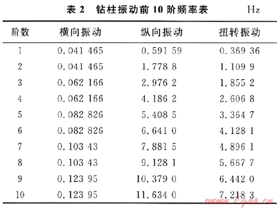 文中對鉆柱的振動模態分析擴展到20階模態,但是根據大量研究試驗可知,10階模態就足以表明鉆柱的振動情況。表2列出了鉆柱橫向、縱向、扭轉振動的前10階頻率。