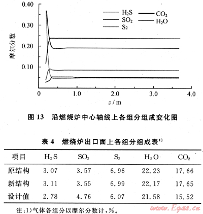 圖13為沿燃燒爐軸線方向各組分組成變化圖。由硫生成曲線來看,單質(zhì)硫在燃燒器內(nèi)增量最快,之后呈非常緩慢的增長(zhǎng)趨勢(shì)。表4為改進(jìn)前后燃燒爐出口面上各組分的組成表,由表4可知,出口處各組分含量與燃燒爐實(shí)際運(yùn)行值較為吻合,而與原結(jié)構(gòu)相比,新結(jié)構(gòu)出口面上S2的摩爾分?jǐn)?shù)提高了0.03%,說明采用外環(huán)酸氣入口提高了爐內(nèi)氣體混合效果并進(jìn)而提高了燃燒爐的總硫轉(zhuǎn)化率。