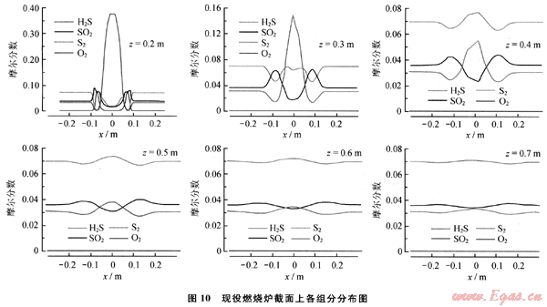由各組分分布來看,H2S在各截面軸線上呈單駝峰式分布,在旋轉(zhuǎn)射流內(nèi)部含量最高;S02呈雙駝峰式分布,在火焰區(qū)內(nèi)旋轉(zhuǎn)射流的外圍邊界層上含量最高;受射流外圍氣體回流影響,硫組分含量在旋轉(zhuǎn)射流外部含量最高。